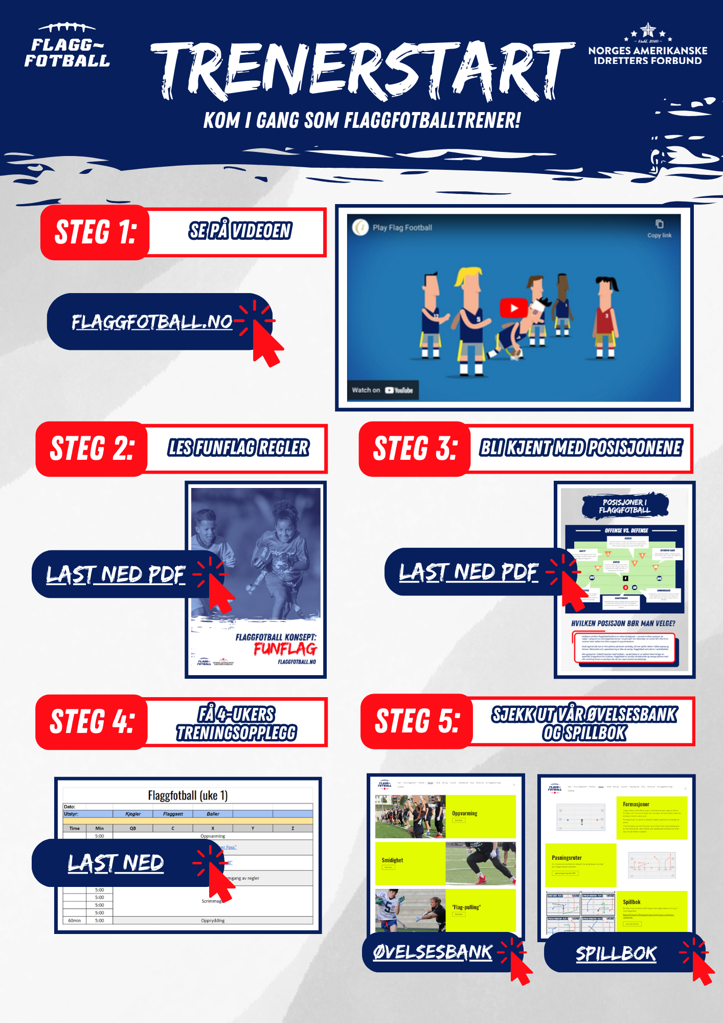 Bli flaggfotballtrener i 5 enkle steg med vårt TrenerStart-program! Utviklet av erfarne trenere, gir TrenerStart deg en trinn-for-trinn metode som tar deg fra null kunnskap om flaggfotball til å ha kompetansen som kreves for å bli trener. Ved å kombinere TrenerStart med praktisk erfaring på banen, lærer du de grunnleggende ferdighetene i flaggfotball som trengs for å få ditt lag i gang.
